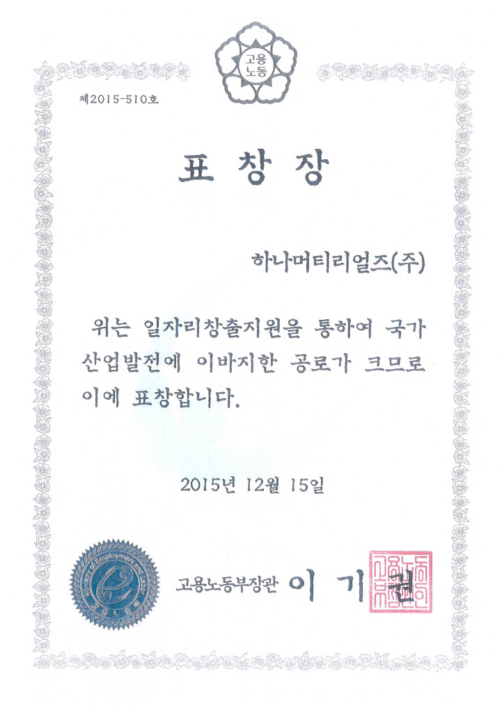 일자리창출 유공 고용노동부장관상 수상