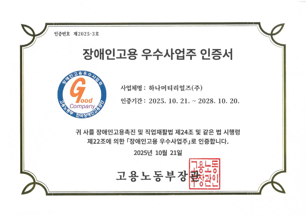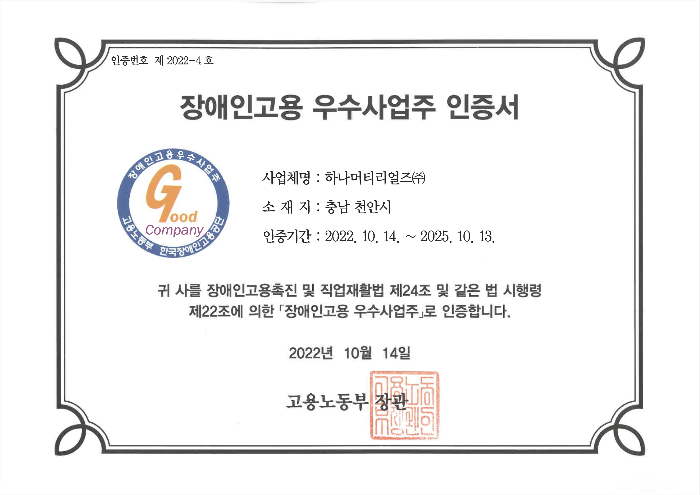 장애인고용 우수사업주 인증서