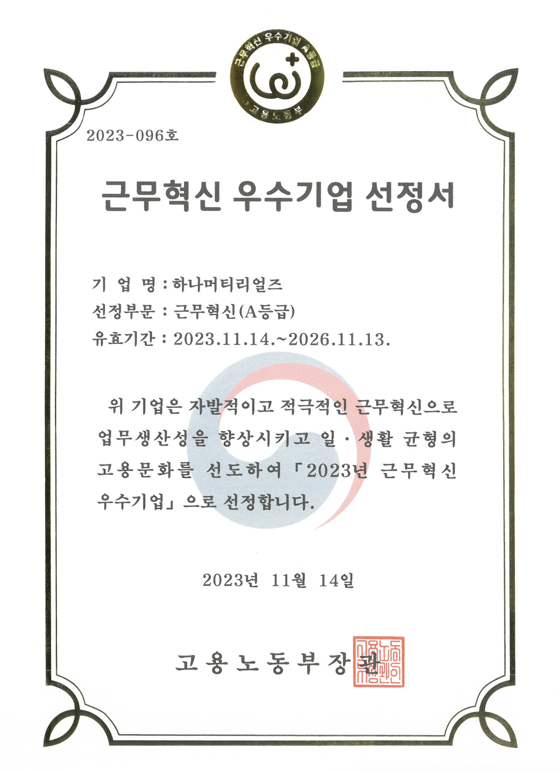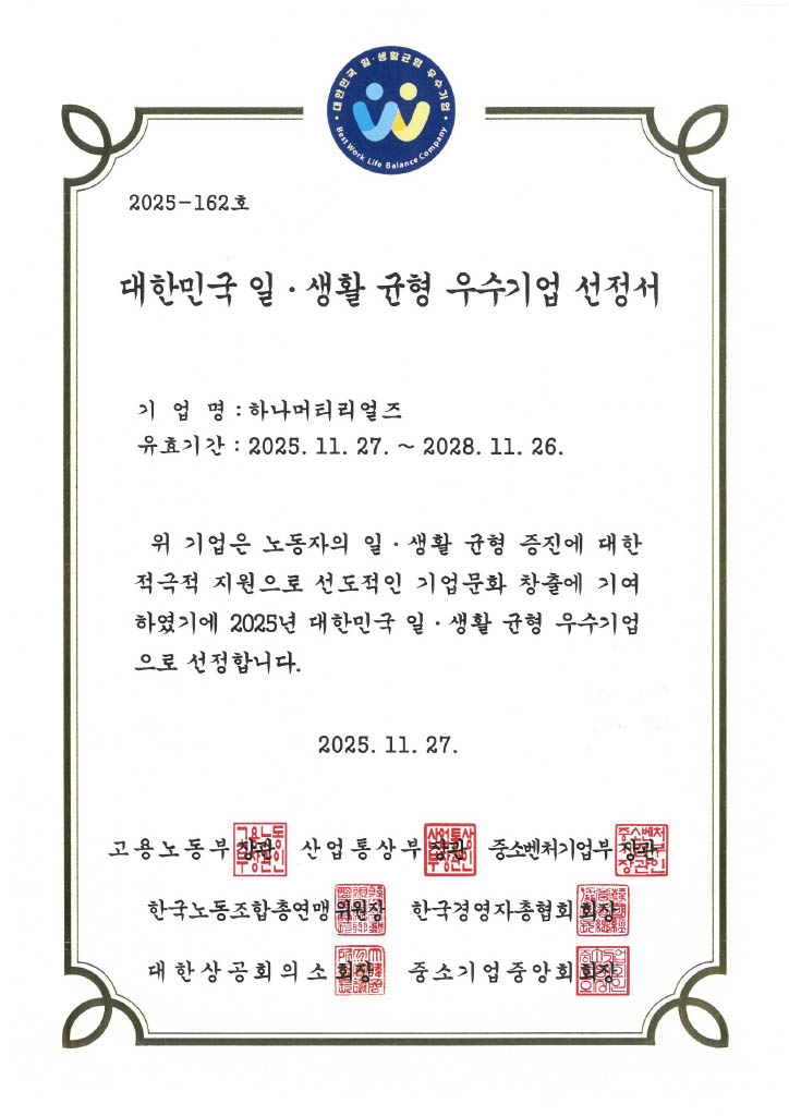 일·생활 균형 우수기업 선정서